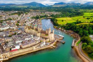 Aerial view of historical town Caernarfon, Wales, United Kingdom