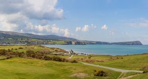 View of Newport Sands Beach from the golf club. Newport, Pembrokeshire, Wales. UK