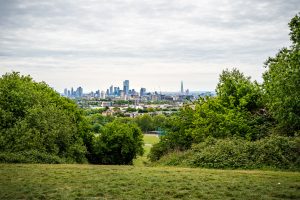 A view across the fields and trees to the City of London from the Parliament Hill Viewpoint in Hampstead Heath, London