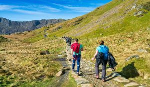Hikers on Pyg track at Pen-y Pass in Snowdon. North Wales