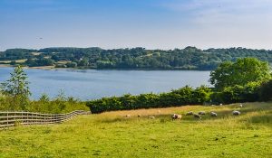 Rutland Water a large reservoir in Leicestershire. With blue sky, green grass and trees.