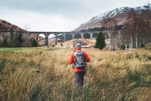 Man traveler walks neaar famous Glenfinnan viadukt in Scotland
