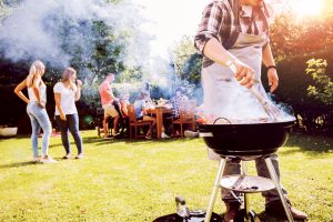 Summer,Garden,Bbq,Party,With,Grill,And,People,In,Background