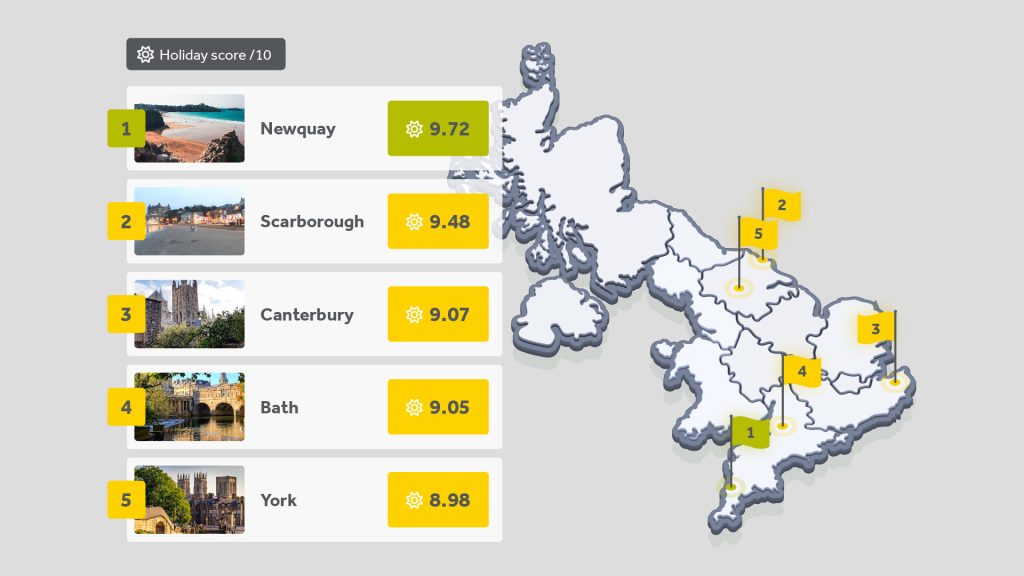 Coming in first place as 2024’s UK holiday hotspot, Newquay scores 9.72 out of 10. Located on the north coast of Cornwall, the town is well known for its sandy beaches, with the Atlantic Ocean lapping at its shore.