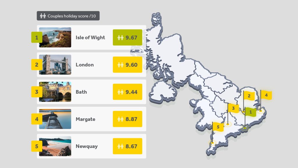 | Rank | Location | Average Annual Temperature (ºC) | Average Annual Rainfall (mm) | Average Hotel Price Per night, July (double room) | Google Searches for Staycations | Social Media Staycation Hashtag Posts | Percentage of Couples Activities | Percentage of Romantic Restaurants | Number of Glamping Sites | Number of Lodges | Percentage of 4*+ Hotels | Couples Holiday Score /10 |