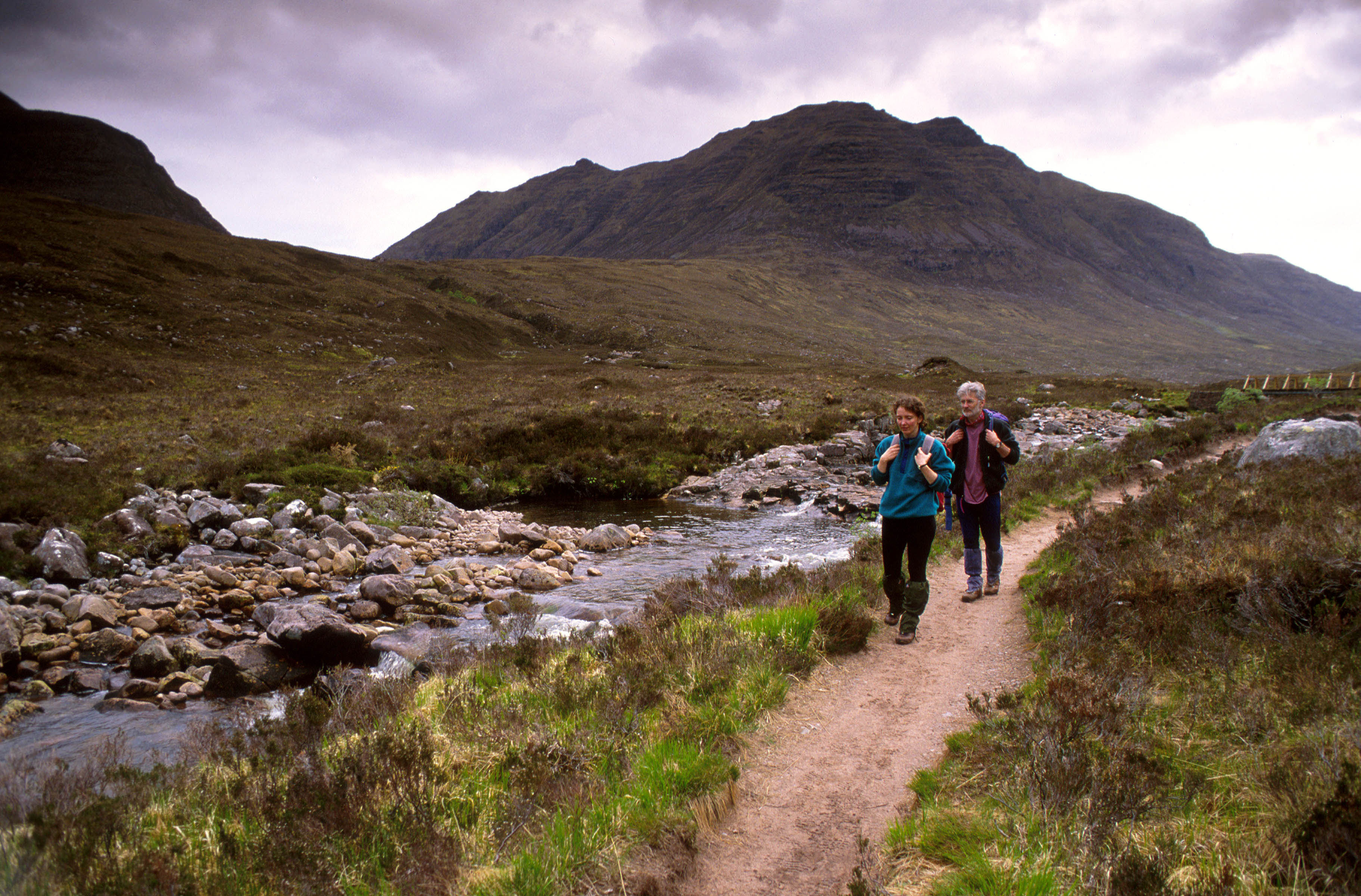TWO HILL WALKERS MAKE THEIR WAY ALONG A PATH AT THE EDGE OF A MOUNTAIN STREAM IN TORRIDON, NORTH WEST HIGHLANDS